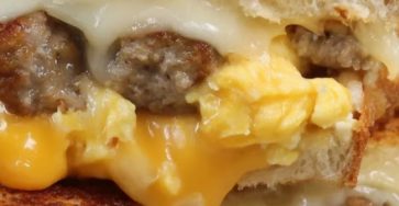 breakfast sandwich featuring buttery grilled sourdough filled with scrambled eggs, Colby-Jack cheese, and seasoned breakfast sausage creates a hearty, flavorful…