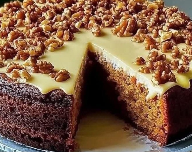 Ingredients:For the Cake:2 cups all-purpose flour2 teaspoons baking powder1 ½ teaspoons baking soda1 teaspoon ground cinnamon½ teaspoon ground nutmeg½ teaspoon ground ginger½ teaspoon salt1 cup granulated sugar1 cup brown sugar, packed4 large eggs1 cup vegetable oil½ cup unsweetened applesauce1 teaspoon vanilla extract3 cups grated carrots (about 3–4 medium carrots)1 cup chopped walnutsFor the Cream Cheese Frosting:8 oz (1 block) cream cheese, softened½ cup unsalted butter, softened4 cups powdered sugar1 teaspoon vanilla extract1–2 tablespoons milk (for desired consistency)PREPARATION:Step 1: Prepare the BatterPreheat your oven to 350°F (175°C). Grease and flour two 9-inch round cake pans or line them with parchment paper.In a medium bowl, whisk together the flour, baking powder, baking soda, cinnamon, nutmeg, ginger, and salt. Set aside.In a large bowl, whisk together the granulated sugar, brown sugar, eggs, vegetable oil, applesauce, and vanilla extract until smooth.Gradually add the dry ingredients to the wet ingredients, mixing just until combined.Fold in the grated carrots and chopped walnuts.Step 2: Bake the CakeDivide the batter evenly between the prepared cake pans.Bake in the preheated oven for 30–35 minutes, or until a toothpick inserted in the center comes out clean.Let the cakes cool in the pans for 10 minutes, then transfer them to a wire rack to cool completely.Step 3: Prepare the Cream Cheese FrostingIn a large mixing bowl, beat the cream cheese and butter until smooth and creamy.Gradually add the powdered sugar, one cup at a time, beating well after each addition.Mix in the vanilla extract and enough milk to reach your desired frosting consistency.Step 4: Assemble the CakePlace one cake layer on a serving plate and spread a generous layer of frosting on top.Add the second cake layer and frost the top and sides of the cake.Decorate with additional chopped walnuts or grated carrots if desired.Tips for the Best Carrot Walnut CakeUse Fresh Carrots: Freshly grated carrots provide the best texture and flavor. Avoid pre-shredded carrots, as they are often too dry.Customize the Mix-Ins: Add raisins, shredded coconut, or crushed pineapple for additional flavor and texture.Chill the Frosting: If the frosting becomes too soft, chill it in the refrigerator for 10–15 minutes before spreading.Nutritional Information (Per Serving)Calories: ~420Carbohydrates: ~54gProtein: ~5gFat: ~20gFiber: ~2gWhy You’ll Love This RecipeThis Carrot Walnut Cake is moist, flavorful, and packed with the perfect blend of spices. It’s a versatile dessert that works just as well for a birthday celebration as it does for a casual weekend treat. The creamy cream cheese frosting takes it to the next level, making every bite irresistibleEnjoy !