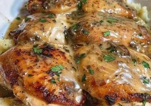 - Plate the Dish: Place a generous serving of mashed potatoes on each plate. Top with the chicken thighs and spoon the savory sauce over the top.