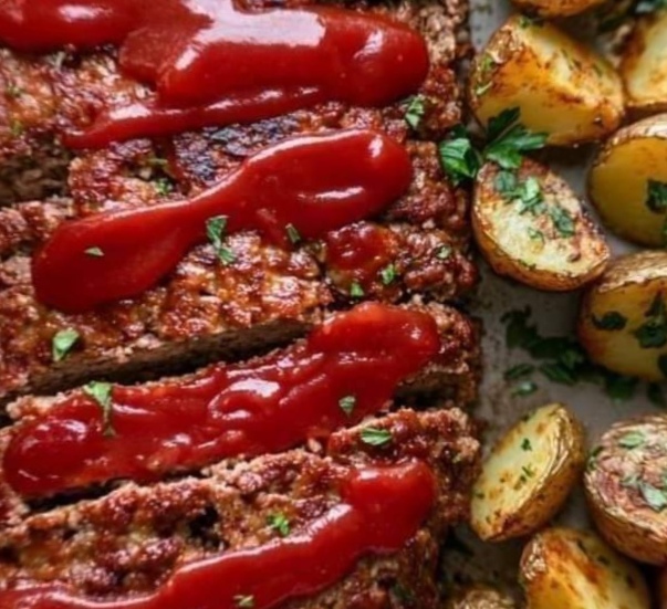 This classic meatloaf with roasted potatoes is a comforting and satisfying meal, perfect for any family dinner.