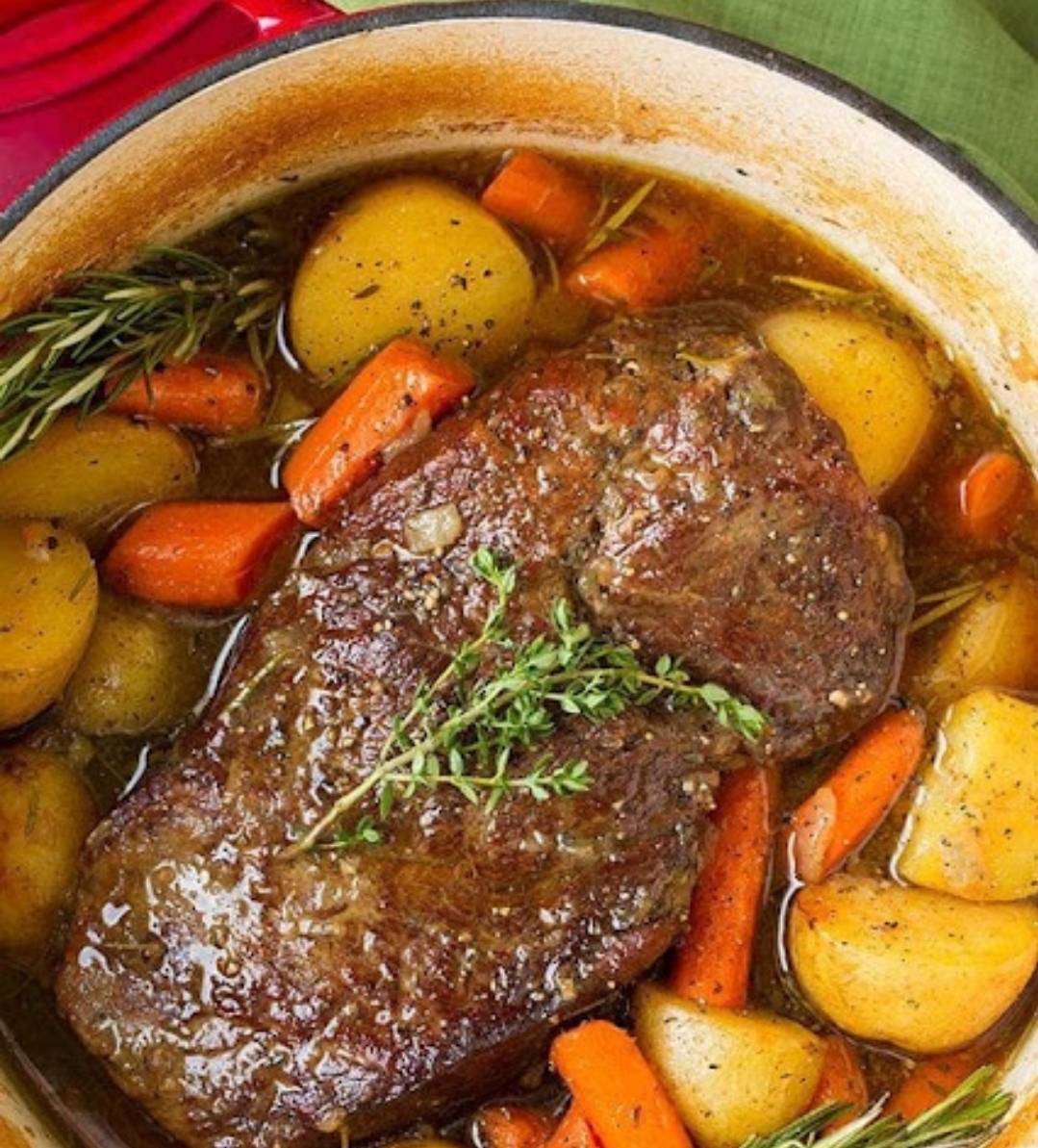 °3 pounds roasted chuck, shoulder cut° salt and black pepper to taste° 2 tablespoons of olive oil° 1 chopped onion°3 garlic cloves, crushed or pressed° 1 tablespoon of tomato paste° 2 tablespoons all-purpose flour and cassava flour°1/2 cup red wine°2 cups beef broth°2 lbs small yellow potatoes°1 pound carrots, chopped°2 bay leaves° fresh parsley or cilantro° fresh thyme