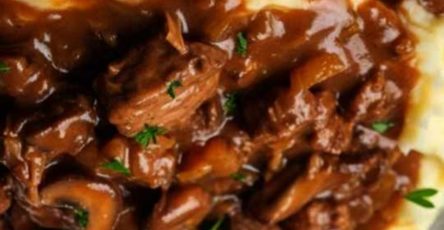 Reintroduce the beef into the pot. Carrots and potatoes should be placed around the steak in the soup. Cook for 2 1/2 to 3 hours at 350°F, covered.
