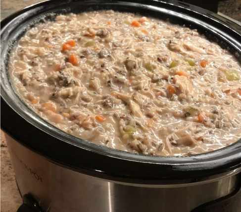 Add this to the rice and chicken in the crockpot and stir to combine. Add extra water or milk to adjust the consistency as you like it. Season with additional salt and pepper.