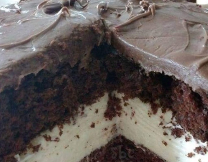 Once the cakes are completely cooled, spread the cream cheese filling evenly over the bottom layer. Carefully place the second layer on top and smooth the sides. Frost the cake with the milk chocolate frosting, ensuring both the sides and top are well covered.