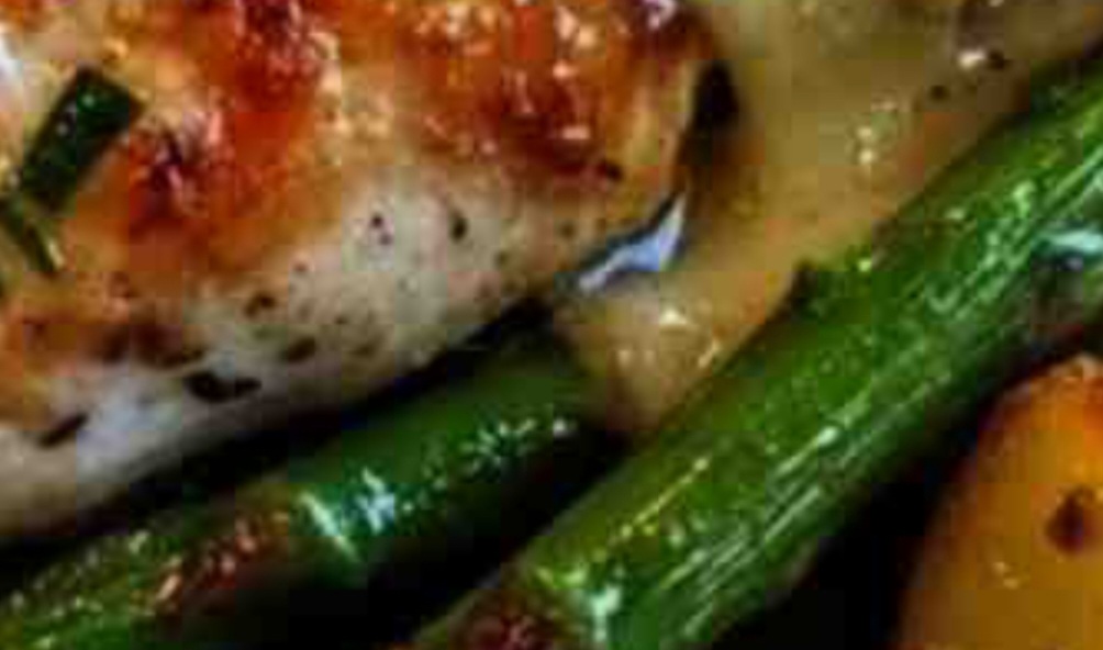 - Add asparagus to the baking tray with potatoes. Place the seared chicken on top.