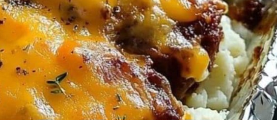 Put together and bake: After the meatloaf is finished baking, cover the top with mashed potatoes. Put some grated cheddar cheese on top. Cook under the broiler for 3-5 minutes, or until the cheese is melted and bubbly.