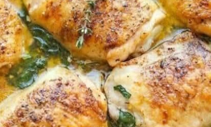 Pour une belle couleur dorée et un goût plus riche, assure-toi de bien saisir les cuisses de poulet sur chaque côté avant de les cuire au four. Cela donne aussi plus de texture à la peau.