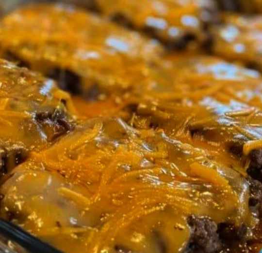 6. Place the browned hamburger patties over the onions, then cover with the remaining potatoes and onions.