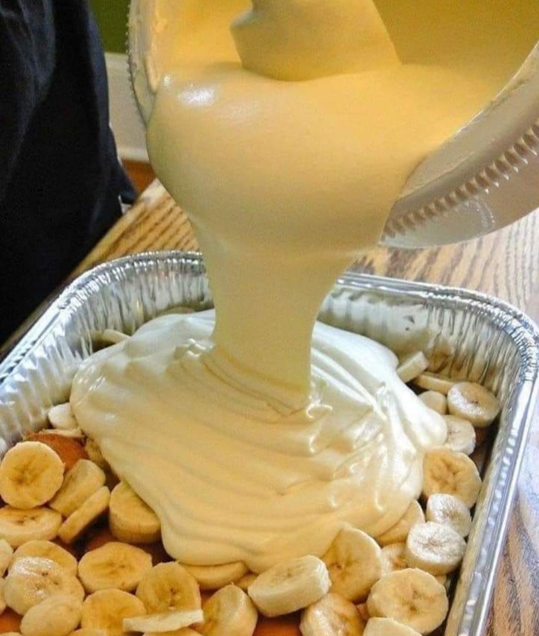 Next, top the bananas with the whipped cream mixture and smooth out even with a rubber spatula.