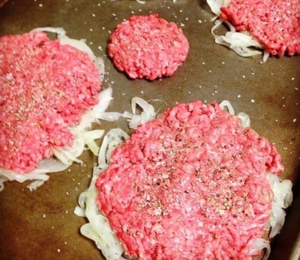 Divide the onions into 4 separate mounds on a rimmed baking sheet. Form the beef into 4 lightly packed balls. Place the beef balls on top of the onion mounds and flatten the beef firmly (use your palm) so the onion adheres to the beef. The patties should measure 4 inches in diameter. Season the beef generously with salt and pepper.
