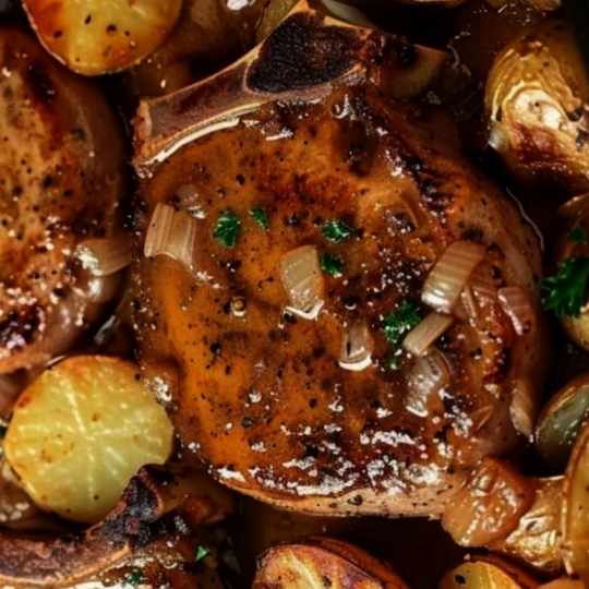 After the pork chops have cooked, arrange them on top of the potatoes. Pour the soup mixture over the chops.