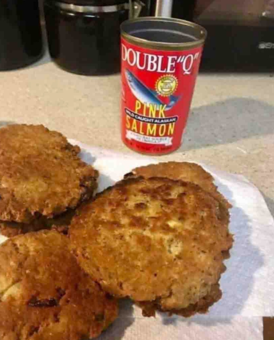 Open salmon and drain thoroughly. Place drained salmon in mixing bowl and flake evenly with a fork.Add onion, corn meal, flour, mayonnaise, and egg. Stir until well blended.Shape the mixture into patties about the size of an average burger or less.Cook in oil in skillet over medium heat until browned on each side. Turn once while frying.Note: The mayonnaise helps the patties hold their shape and keeps them from being too dry.