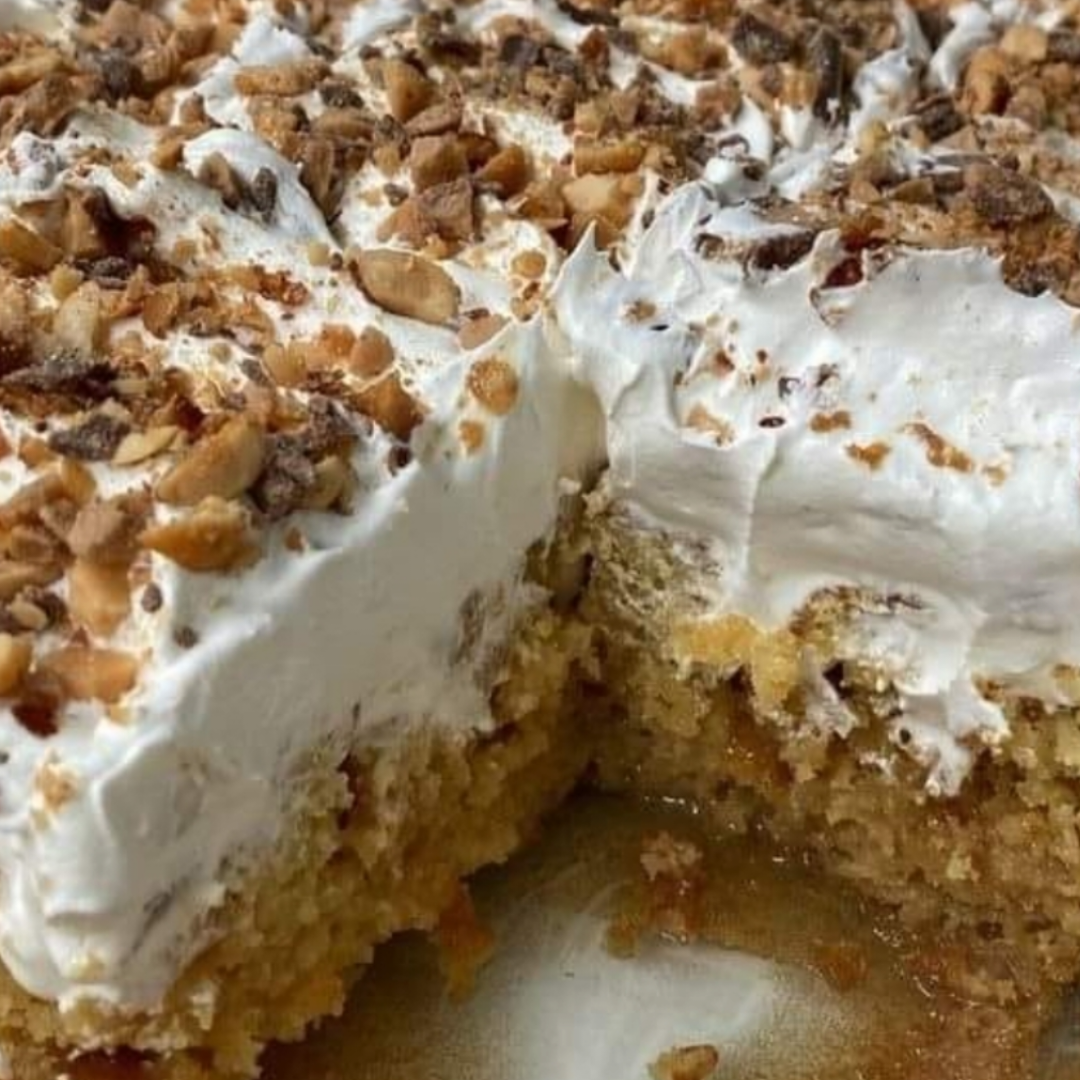1/2 cup of chunks of toffeeCake Recipe with Toffee and Butterscotch FillingGet the oven preheated to 350F. Spray cooking spray onto a 9×13-inch pan and line it with foil for easy cleaning.